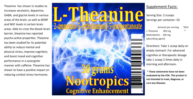 Theanine has shown in studies to increases serotonin, dopamine, GABA, and glycinelevels in various areas of the brain, as well as BDNFand NGFlevels in certain brain areas. Able to cross the blood–brain barrier, theanine has reported psycho-activeproperties. Theanine has been studied for its potential ability to reduce mental and physical stress, improve cognition, and boost mood and cognitive performance in a synergistic manner with caffeine. Theanine has shown to have a positive impact on reducing cortisol stress hormones.
